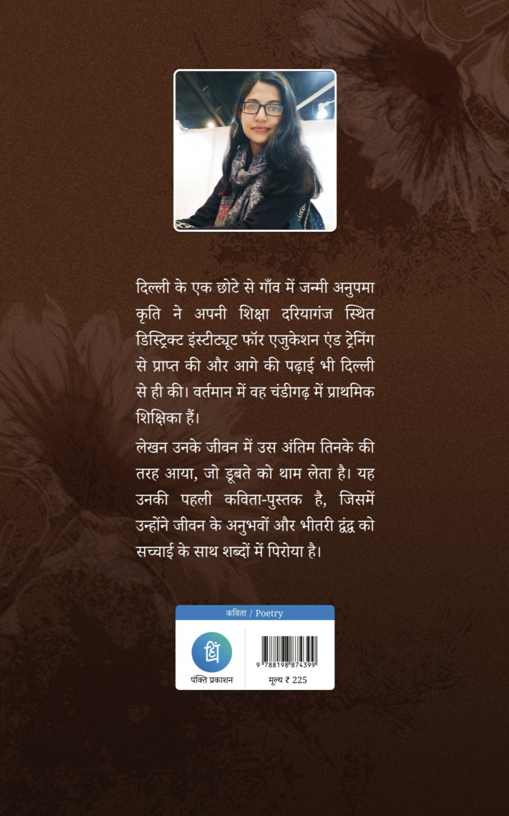 लेखन उनके जीवन में उस अंतिम तिनके की तरह आधा, जो डूबते को थाम लेता है। यह उनकी पहली कविता-पुस्तक है, जिसमें उन्होंने जीवन के अनुभवों और भीतरी द्वंद्व को सच्चाई के साथ शब्दों में पिरोया है।